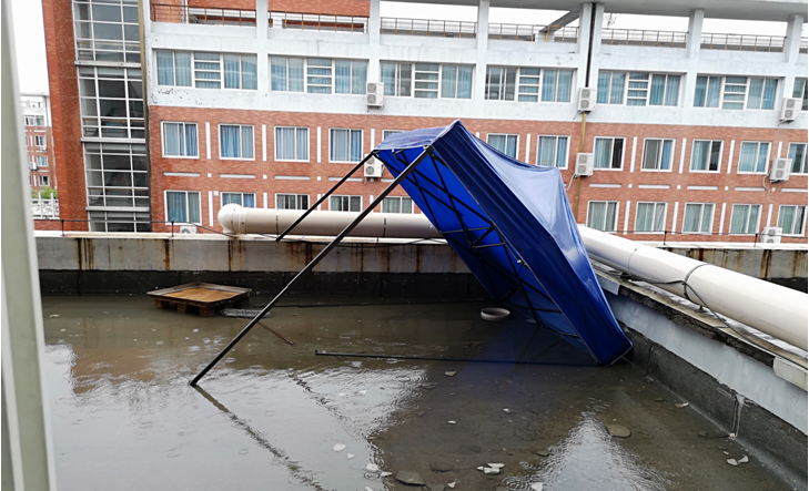 7月20日,开封遭遇史上罕见暴雨,学院迅速启动突发事件应急预案,立即安排专人到学院相关楼栋排查,晚上10时,经巡查发现,A座楼顶楼走廊漏雨严重并迅速在地面形成积水,开始向邻近实验室蔓延。