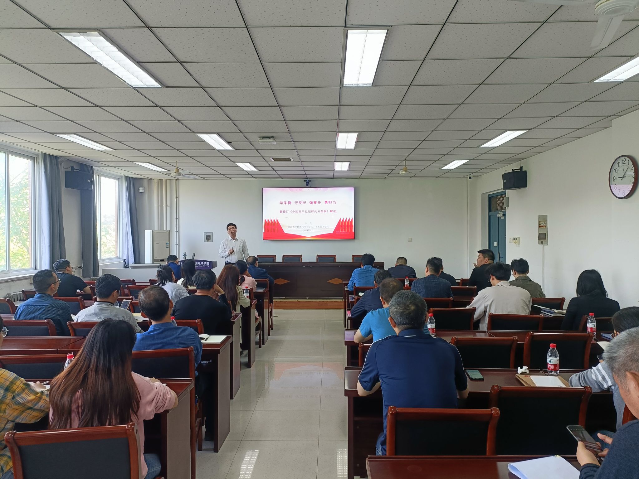 26日上午,张慧以《学条例 守党纪 强责任 勇担当》为题作专题辅导报告。他从《条例》概述、党的纪律建设和《条例》制定修订情况、新修订《条例》重点内容解读等三个方面为大家上了一堂内容丰富的党课。他强调,要深刻认识开展党纪学习教育的重要意义,切实增强开展党纪学习教育的政治自觉、思想自觉和行动自觉;要深入领会修订《条例》的重点内容和着力方向,强化自我约束,提高免疫能力;要凝聚干事创业的精气神,为学校“双一流”“双航母”建设作出新贡献。