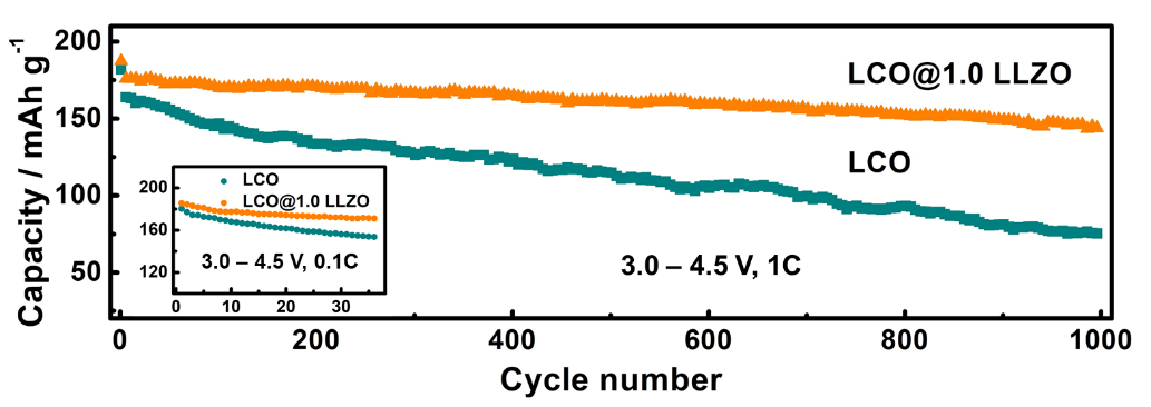图1 快离子导体Li7La3Zr2O12改性后的LiCoO2正极材料在4.5V高截止电压下的长循环特性