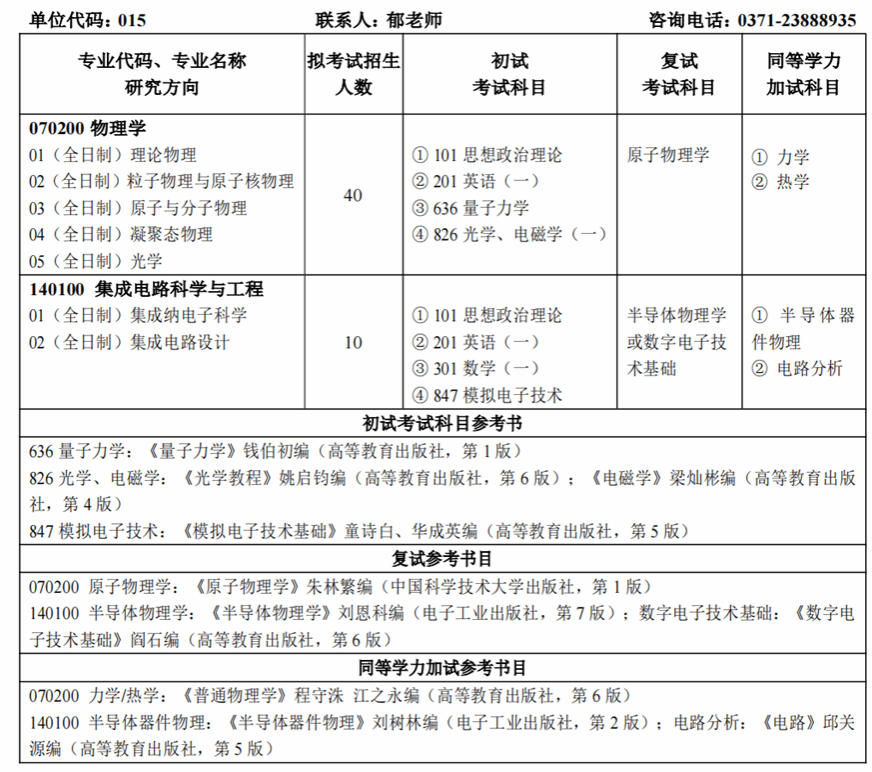 物理学、集成电路科学与工程学科为河南省重点(特色优势)学科;拥有物理学博士后科研流动站,物理学一级博士学位授权点,物理学、集成电路科学与工程2个一级学术型硕士学位授权点,电子信息专业硕士学位授权点(集成电路工程、光电信息工程)和学科教学(物理)专业学位授权点。