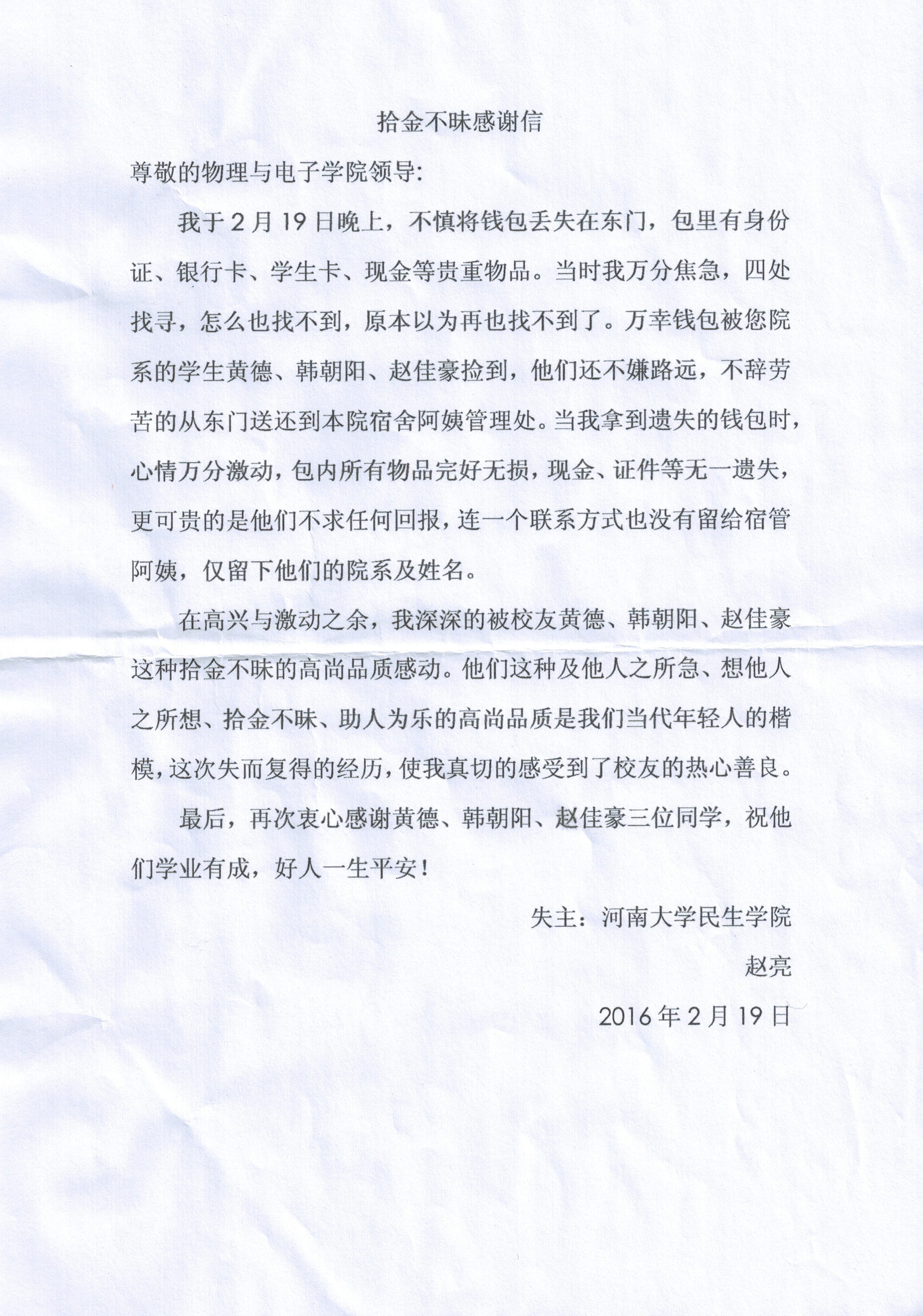 小东门外捡到一个钱包,内有几张银行卡、相关身份证件以及现金2000元左右。三位同学毫不犹豫地根据钱包内的学生证信息,一起前往民生学院送还钱包。因证件信息不完整,麻豆色情片