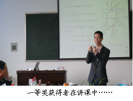 大学物理任课教师共40余人观摩了比赛。本次比赛内容涵盖2010版《理工科类大学物理课程教学基本要求》中的A类要求,参赛教师现场根据抽签决定具体的讲课比赛内容,每人封闭准备时间为1小时,讲课时间为20分钟。经过激烈角逐,大赛评出了一等奖2名,二等奖6名,三等5名,获得一等奖的选手将代表中南地区参加全国总决赛。