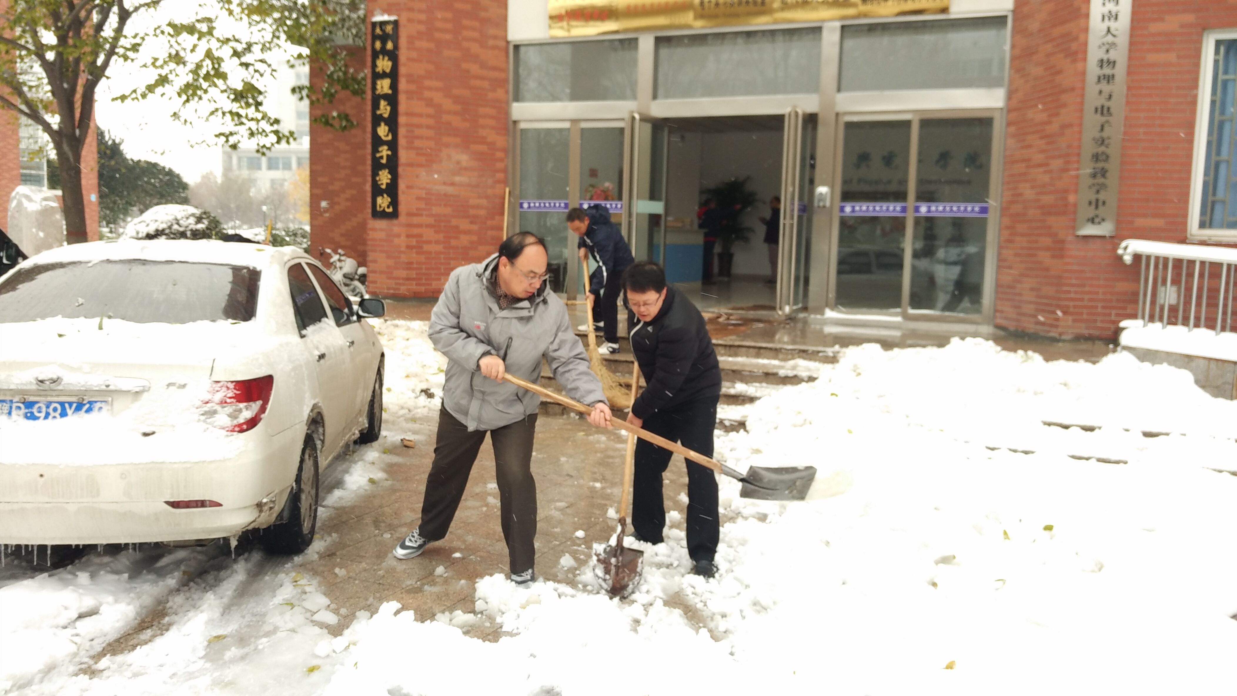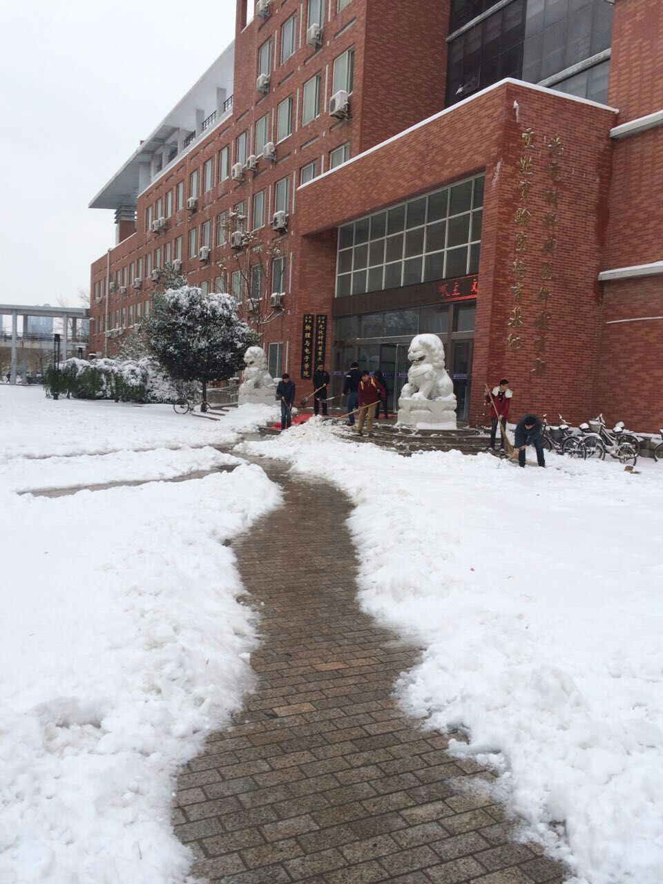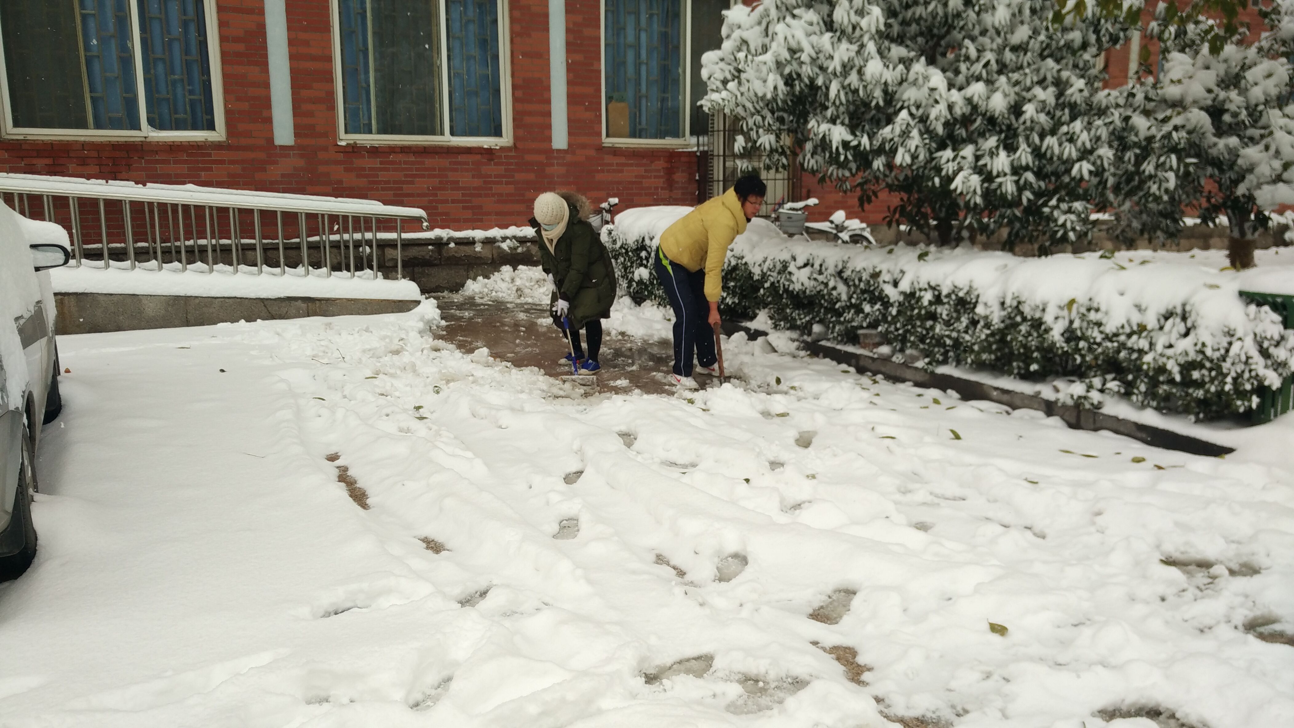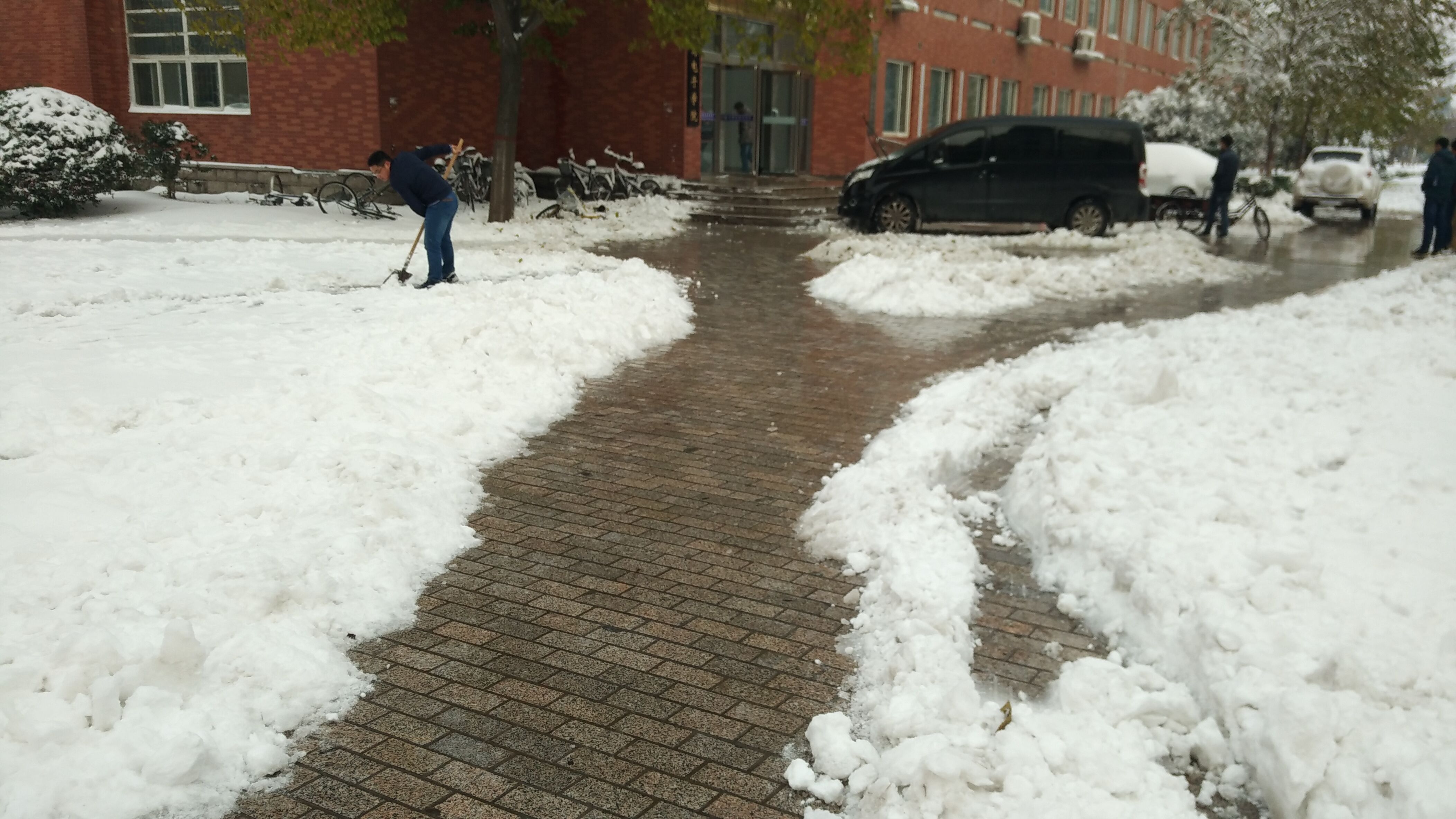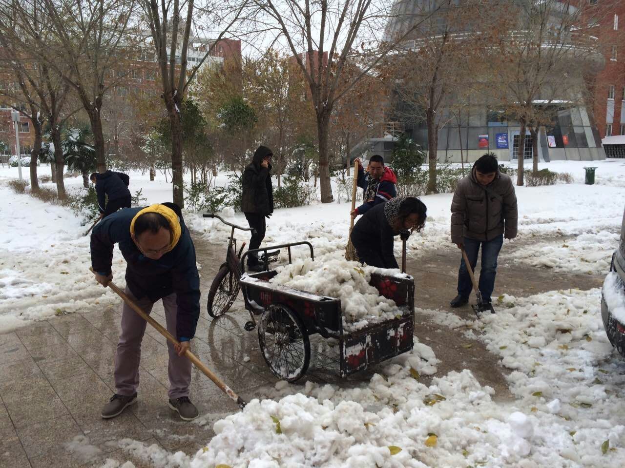 下午14点30分,十几名教职工在学院全体领导班子的带领下一同对学院楼前的道路进行清扫。老师们拿起铁锹、扫帚,或推、或铲、或扫,时而用铁锹敲碎冻冰,时而用扫帚扫开积雪。由于天气很冷,很多老师冻得手脸通红,但这些丝毫没有影响大家的劳动热情。经过两个多小时的紧张劳动,学院楼前各主干道路面上的大部分冰雪基本得到了清理,方便了广大师生的出行。