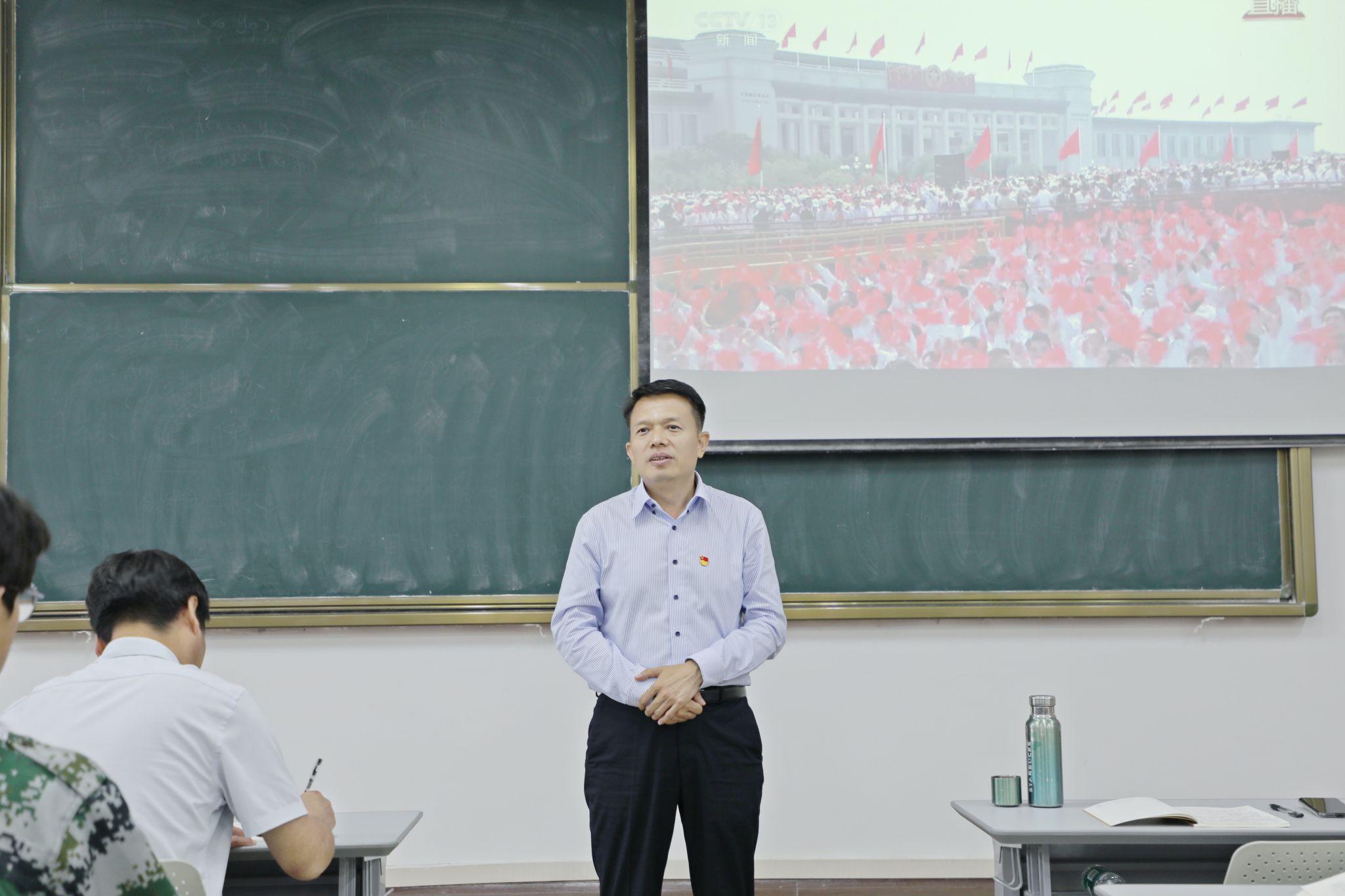 行政党支部联合开展专题党日活动,集中观看纪念中国人民抗日战争暨世界反法西斯战争胜利80周年大会阅兵盛况。校党委书记季波出席并发表讲话。两个支部党员、2025级本科新生代表参会。