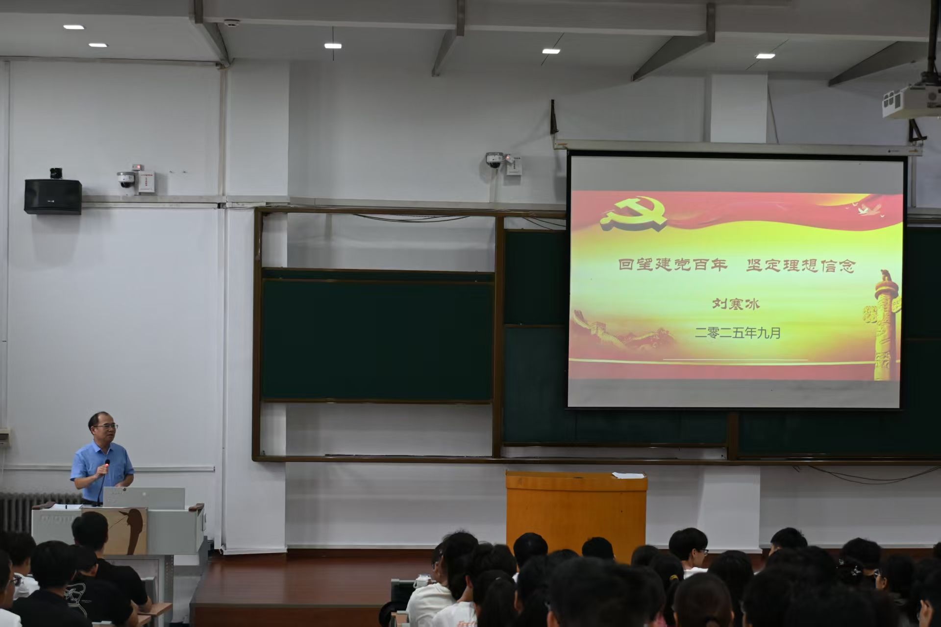 在专业教育环节结束后,学院党委副书记刘寒冰以专题党课接续,搭建 “思想成长”与“专业认知”的衔接桥梁。此次党课以回望建党百年辉煌历程为切入点,紧扣新生入学初期思想塑造需求,旨在引导大家在初步掌握专业方向、明晰学习路径的基础上,进一步锚定理想坐标、涵养责任担当,为大学阶段的全面发展筑牢思想根基,实现专业素养与思想觉悟的同频提升。