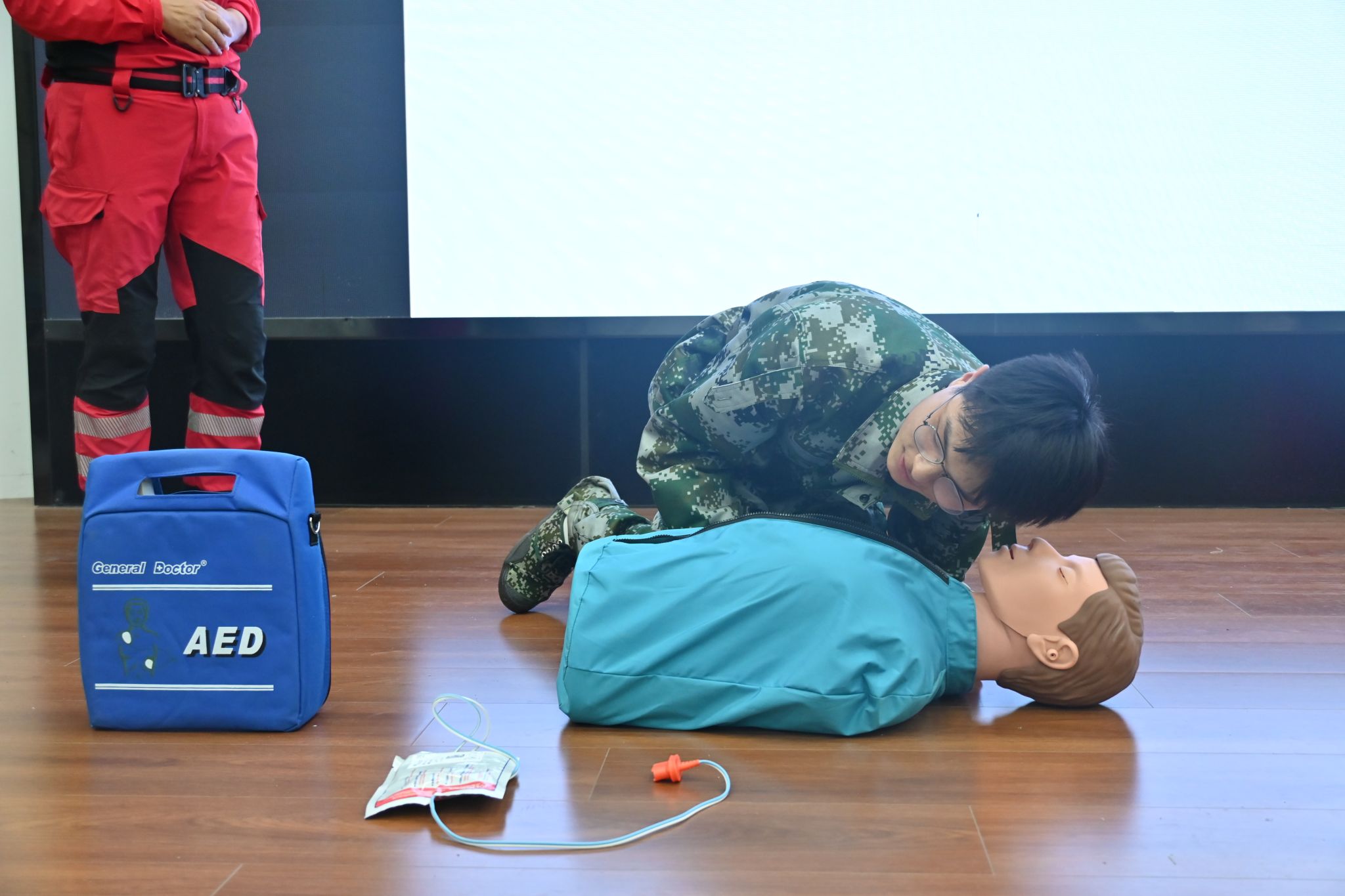 在交流互动实操环节,新生代表在专家的指导下模拟操作心肺复苏按压、止血包扎、异物梗阻急救等关键动作。两位专家全程近距离指导,针对新生操作中出现的手势角度不当、按压力度不足或过大、包扎松紧度不合适等问题,逐一进行纠正,并手把手示范调整,确保每位参与实操的新生都能掌握规范动作。