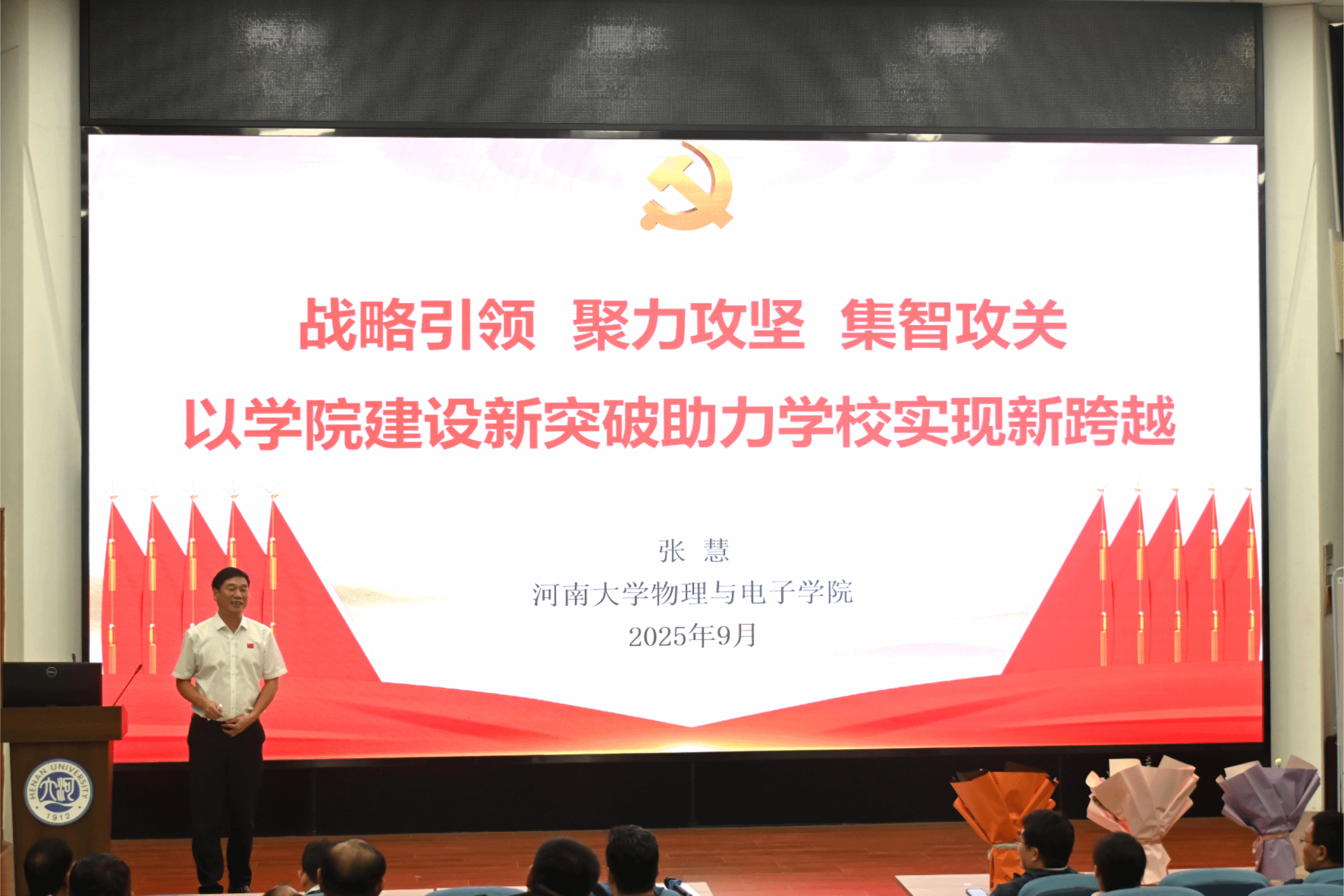 张慧以《战略引领 聚力攻坚 集智攻关 以学院建设新突破助力学校实现新跨越》为题,向全体教师传达学校2025年暑期发展战略研讨会和党委常委会(扩大)会议暨党的建设工作领导小组会议精神。他详细解读了校长张锁江院士在研讨会上提出的“四个强化”发展战略,校党委书记季波关于如何推动各项工作落地见效的工作要求,并对学院落实会议精神和工作要求进行具体部署安排。他表示,学院将以学校暑期发展战略研讨会精神为指引,紧密结合物理与电子学科特色,锚定“双一流”建设目标,在学科布局优化、人才培养模式创新、科研团队建设、高层次人才引育等方面持续发力。他号召全院教师弘扬“自信、拼搏、开放、创新”的新河大精神,以更加饱满的热情、更加务实的作风投入到教育教学与科研工作中,以学院建设的新突破为实现百年名校振兴、“双一流”建设新跨越贡献力量。