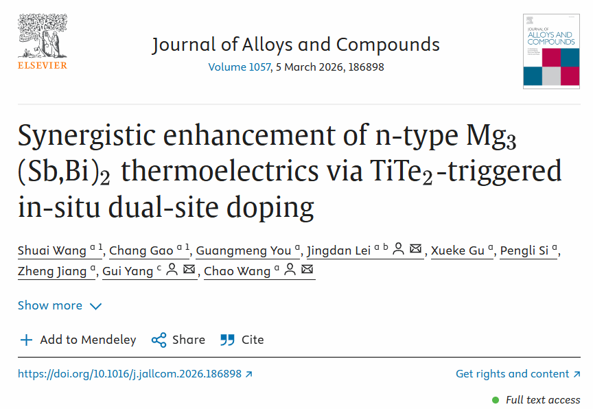 本科生的最新科研成果。2023级本科生王帅、高畅作为共同第一作者,在导师王超教授悉心指导下,完成了题为“Synergistic enhancement of n-type Mg3(Sb,Bi)2 thermoelectrics via TiTe2-triggered in-situ dual-site doping”的研究论文,充分彰显了学院扎实的科研积淀与拔尖创新人才培养的显著成效。