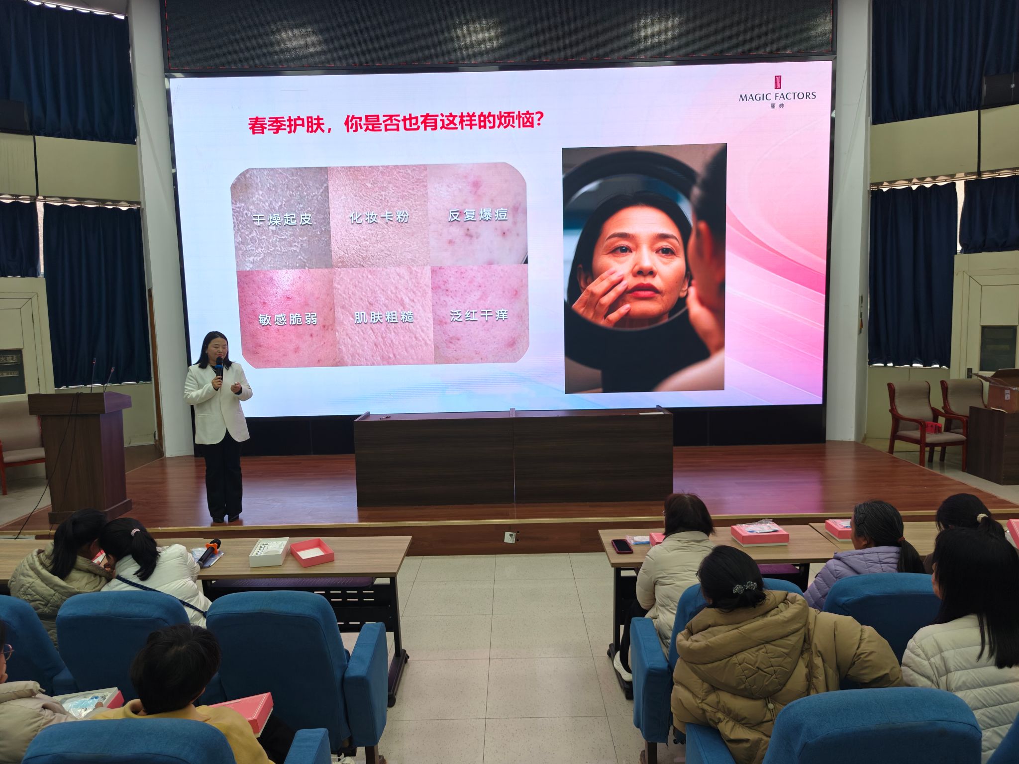 3月12日下午4:30,学院举办“向上的自己 正确科学的护肤”美容护肤品鉴会,邀请专业美容护肤老师现场授课,助力女教工提升护肤知识,绽放女性魅力。