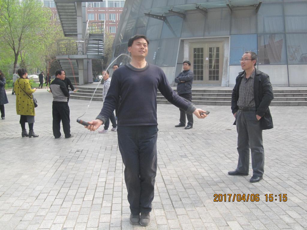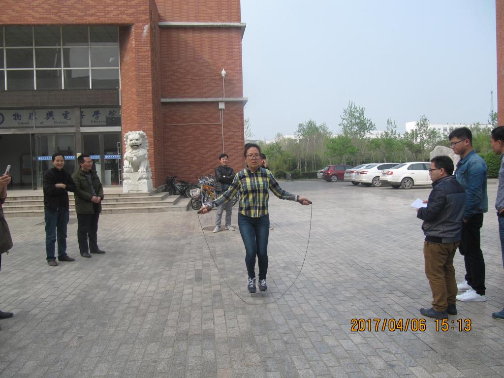 下午15:00,物理与电子学院楼前广场却人声鼎沸,气氛热烈,教职工跳绳比赛正在火热进行。学院领导、院工会委员、各系工会小组长以及没有课的老师积极参加比赛。比赛以工会小组为单位,采用分钟计时,1人一分钟,3人为一组,统计3人的完成次数,然后再进行小组评比排序。经过激烈的角逐,大学物理、物理系工会小组勇夺第一名;行政、基础实验中心工会小组不畏强手,荣获第二名;通信工程系、光伏实验室、电子系、测控系小组喜获第三名。