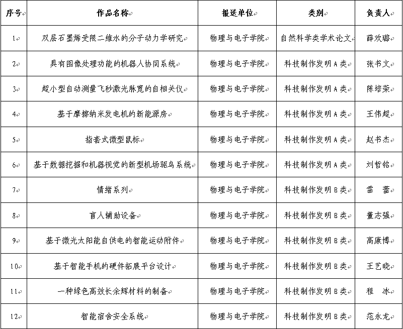 有12件作品最终入选,其中,自然科学类学术论文类1件,科技制作发明A类5件,科技制作发明B类6件。