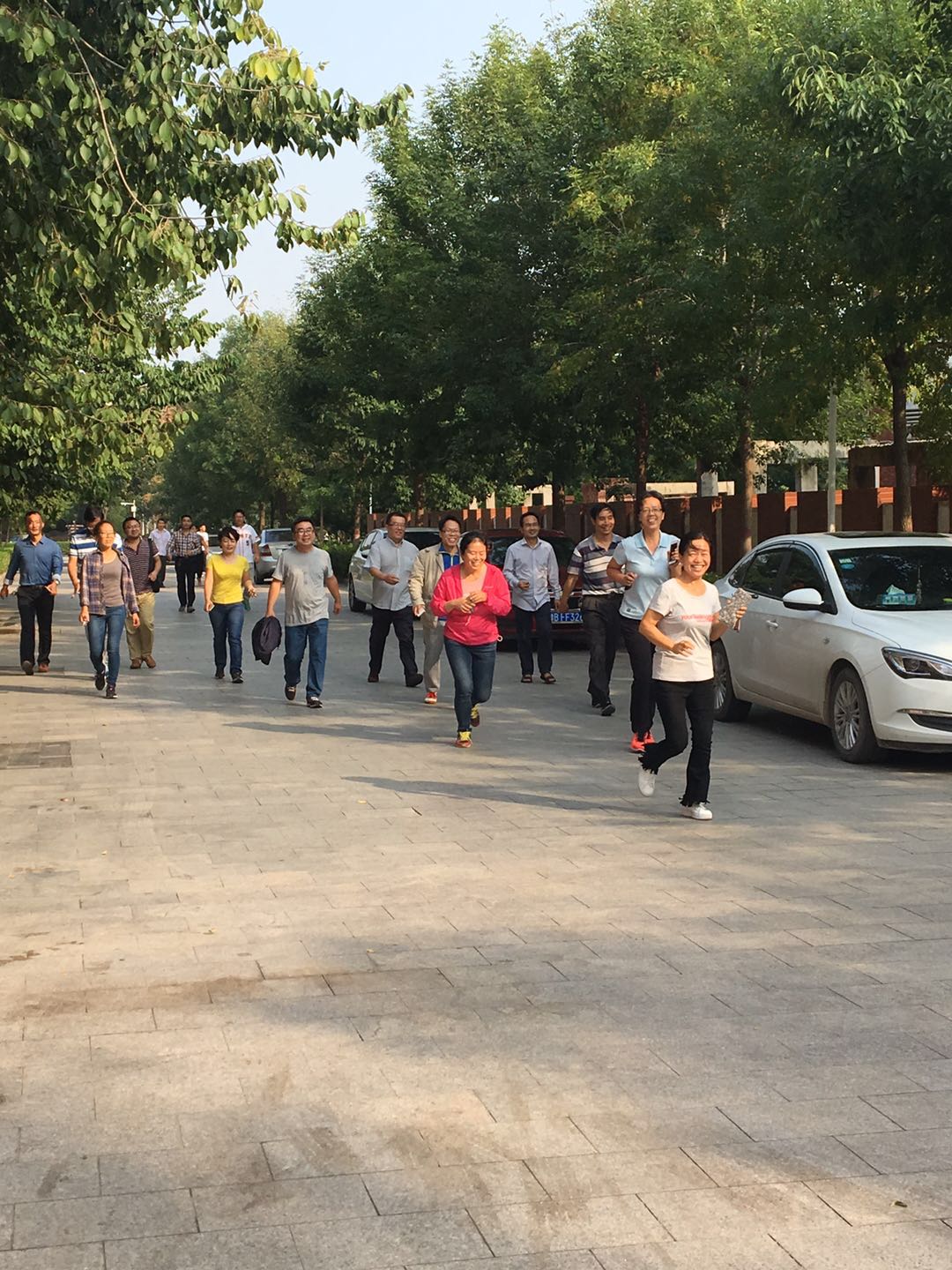 下午15:00活动正式开始。全体职工以工会小组为单位列成8个纵队,在裁判员的指挥下,依次从物理学院楼下门前广场出发,向东沿着中州路环形一圈,最后在学院楼前结束。