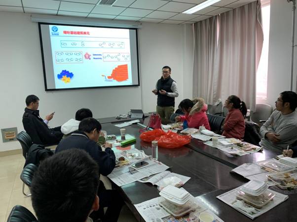 宋金生在报告中介绍了近年来在非富勒烯小分子受体光伏材料的有机合成及器件应用等方面的研究工作。该工作围绕梯形双吡喃稠环结构单元的裁剪,通过封端基团和共轭桥结构调控,开发了一系列性能优异的有机光伏受体材料,并展示了其光伏器件应用。宋金生博士语言幽默风趣,富有启发性,充分激发了大家的学术思维和兴趣,现场讨论气氛热烈,互动性很强。最后,学术午餐会在大家的掌声中圆满结束。