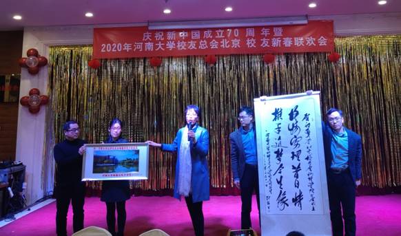 向分会赠送“格物穷理昔日情携手追梦今生缘”书法作品和学院“琴键楼·镜如湖”照片。她简要介绍了学院目前的发展情况,感谢广大校友多年来对物理学院发展的关心支持和大力帮助。她诚挚邀请校友们多回家看看,希望广大校友一如既往地关心和支持学院的发展,为学院发展建言献策、添砖加瓦,继续为母校“双一流”大学建设做出更加积极的贡献。