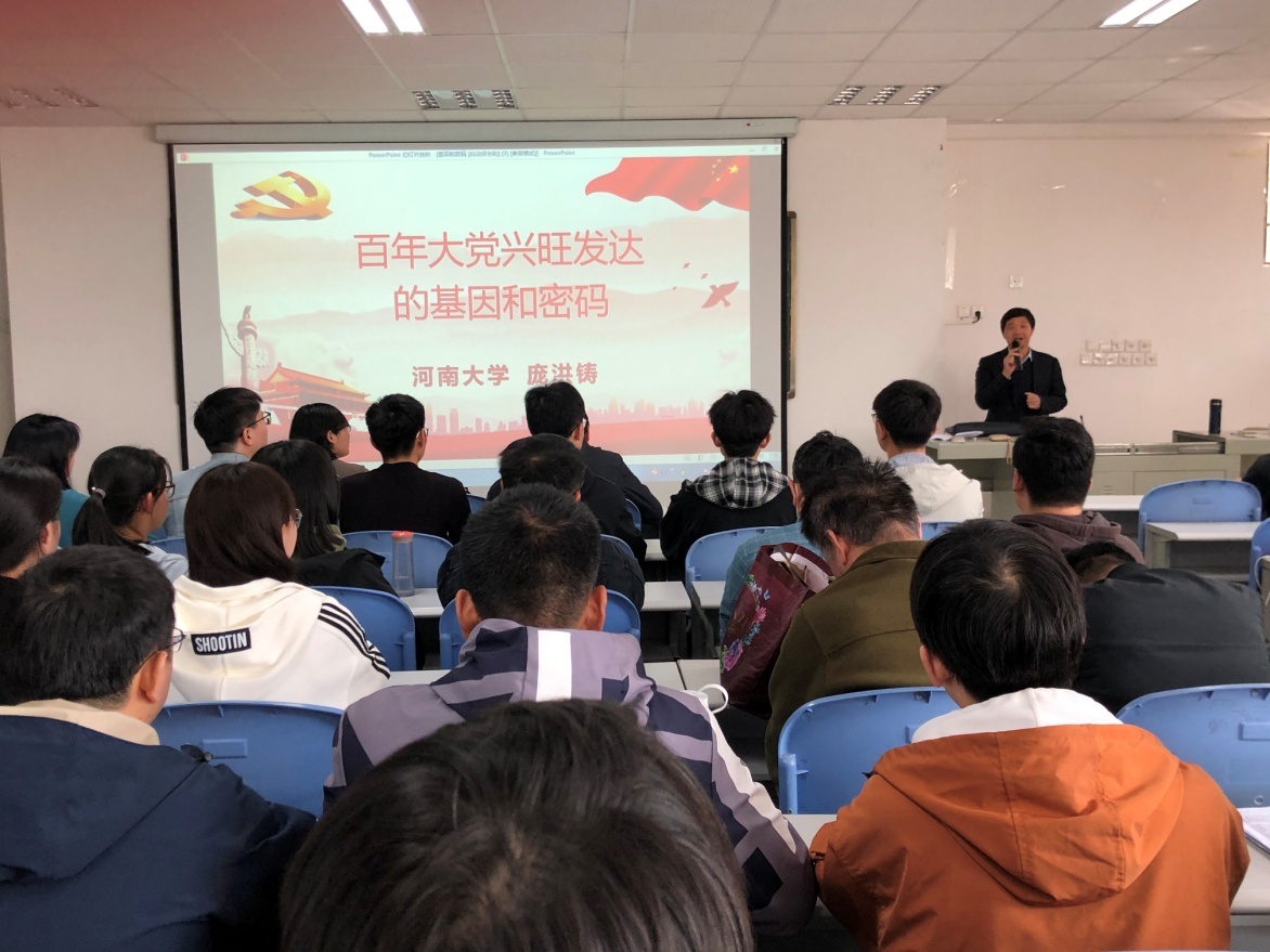动员大会结束后,与会人员聆听了哲学与公共管理学院庞洪铸教授讲授的《百年大党兴旺发达的基因和密码》的专题报告。他在报告中指出,百年来,中国共产党领导中国人民历经艰难险阻,从根本上改变了国家和民族的命运,不断开创着新中国发展的壮丽篇章,带领国家迎来了从站起来、富起来到强起来的伟大飞跃,其根本原因在于党具有独特政治品格和精神气质,是一个具有强大理论优势、政治优势、制度优势、组织优势的政党。