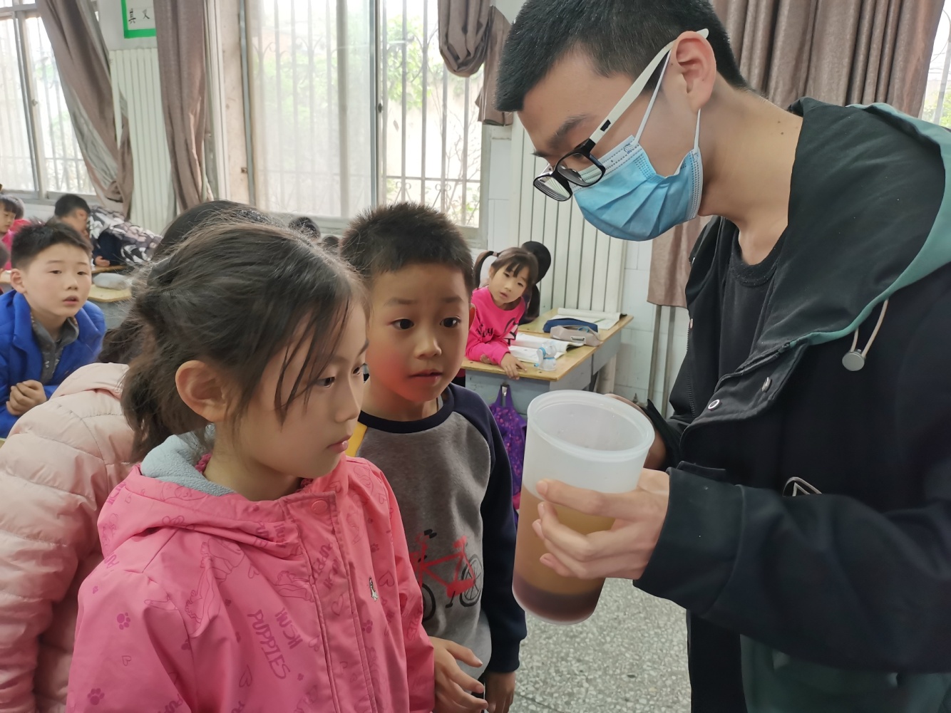 学生志愿者2018级何宇轩、王海洋、李晨睿、徐义娴及2019级李琦为小学生带来了“杯中的可乐会下降”、“螺帽自动旋进旋出螺栓”和“水果电池”三个实验。