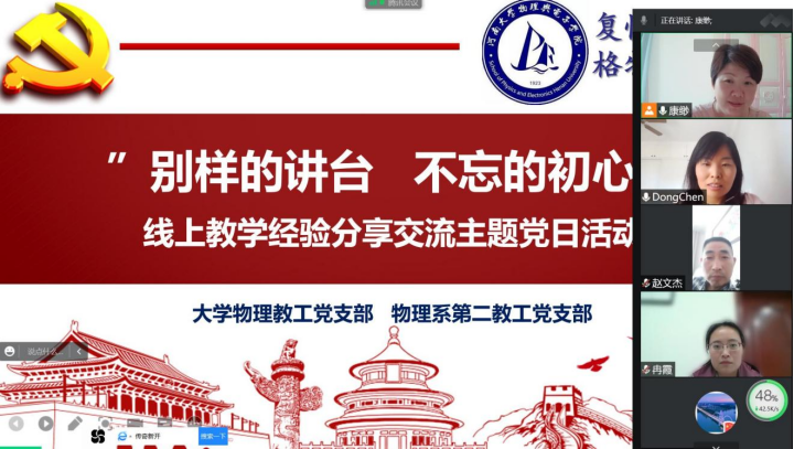 康缈对最近线上教学情况进行了总结,并强调指出“一个支部就是一个堡垒,一名党员就是一面旗帜”,在防疫和教学中要充分体现党支部的战斗堡垒作用和党员的先锋模范作用。物理系第二教工党支部书记陈冬谈到:经过几个学期的实践,老师们积累了丰富的线上教学经验,而物理二支部将近一半都是最近三年入职的青年教师,无论线下还是线上教学经验都稍显不足,非常高兴有这个互相交流、互相学习的机会。大学物理教工党支部李若平、阴化冰老师分享了在智慧树、学习通和钉钉等不同教学平台的应用感受,以及在调动课堂气氛、加强师生互动等方面的经验方法。物理系第二教工党支部年轻教师杨丽雅和刘仁明在交流经验的同时也提出了自己遇到的困难,比如线上教学对于有大量公式推导的课堂不太方便、学生收发作业的问题怎么解决、电子书的版权问题等。针对两位老师的问题,支部党员进行了热烈的讨论:李若平老师建议公式较多可以应用数位板,实现线上同步公式推导;康缈老师建议老师们选择一个智慧教学平台建课,将视频、动画、课件、测试题目等资源上传平台,更可以解决线上教学收发作业不便的问题。