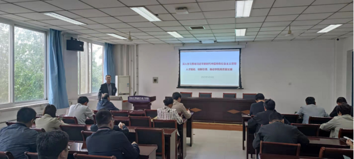 学习贯彻习近平新时代中国特色社会主义思想主题教育理论宣讲团成员、马克思主义学院副教授张涛作《“互联网+”背景下的意识形态建设》专题报告。他结合相关案例以及国内外的时政热点事件,围绕意识形态工作的极端重要性,从“当前思想与意识形态建设的新形势”等四个方面进行深入浅出的讲解。当前我国正在经历百年未有之大变局,网络时代信息丰富繁杂,传播渠道多样、速度飞快,意识形态传播既面临着前进发展的机遇,也遇到了前所未有的挑战。他要求与会人员严格落实意识形态工作责任制,形成共同维护意识形态安全的强大合力,以更加坚定的政治自觉和更加有力的工作举措,把意识形态工作的各项要求贯彻落实到教学、科研、管理等各项工作之中,切实维护学校意识形态安全。