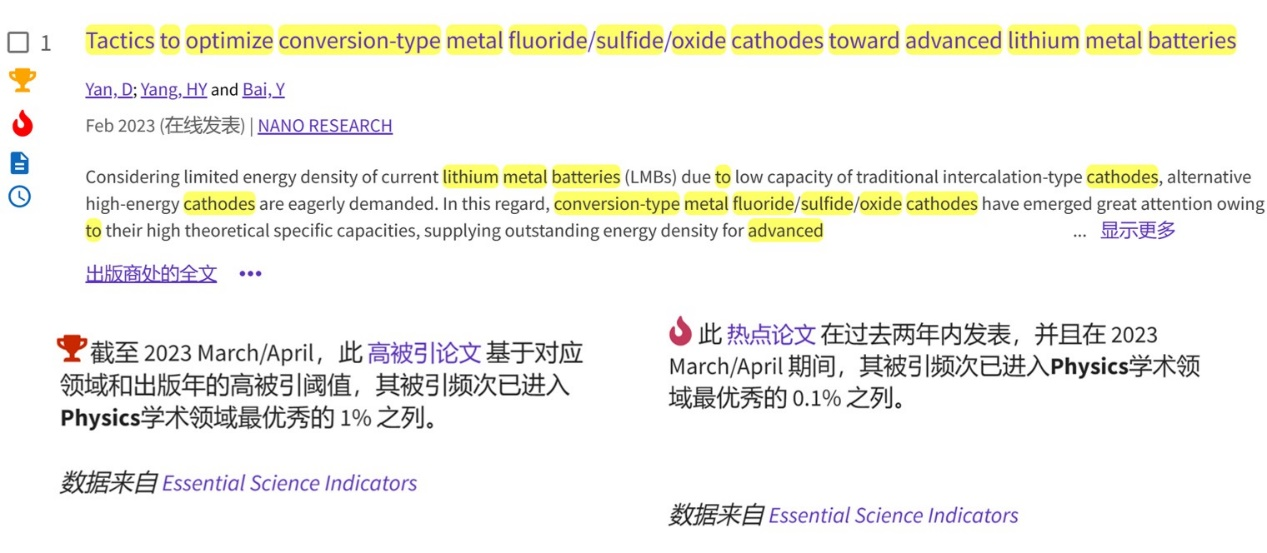 ESI是基于科睿唯安 Web of Science 核心合集数据库的深度分析型研究工具,它以引文分析为基础,对国家/地区、机构、科学家以及期刊的学术水平和影响力进行全面衡量。其中,ESI热点论文是指近2年内发表的论文在近2月内被引次数排名相应学科领域全球前0.1 %,ESI高被引论文是指近10年内发表的论文被引次数排名相应学科领域全球前1 %,ESI热点和高被引论文是衡量论文作者及其研究成果学术影响力的重要指标之一。