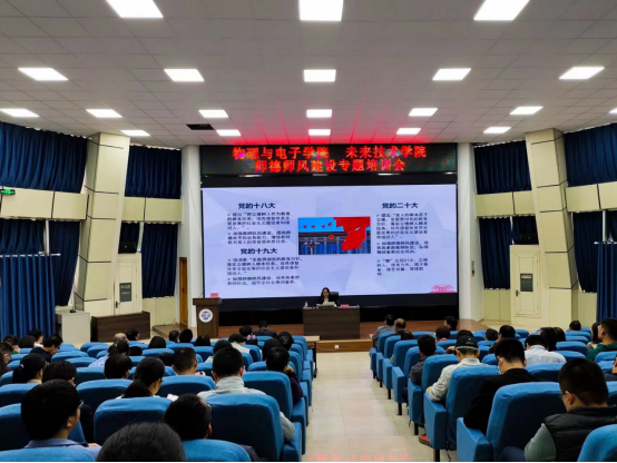、未来技术学院(量子信息)在金明校区锥形报告厅举行师德师风建设专题培训会。校党委教师工作部副部长赵炎应邀为学院全体教职工作师德师风建设专题培训讲座。培训会由党委书记张慧主持。