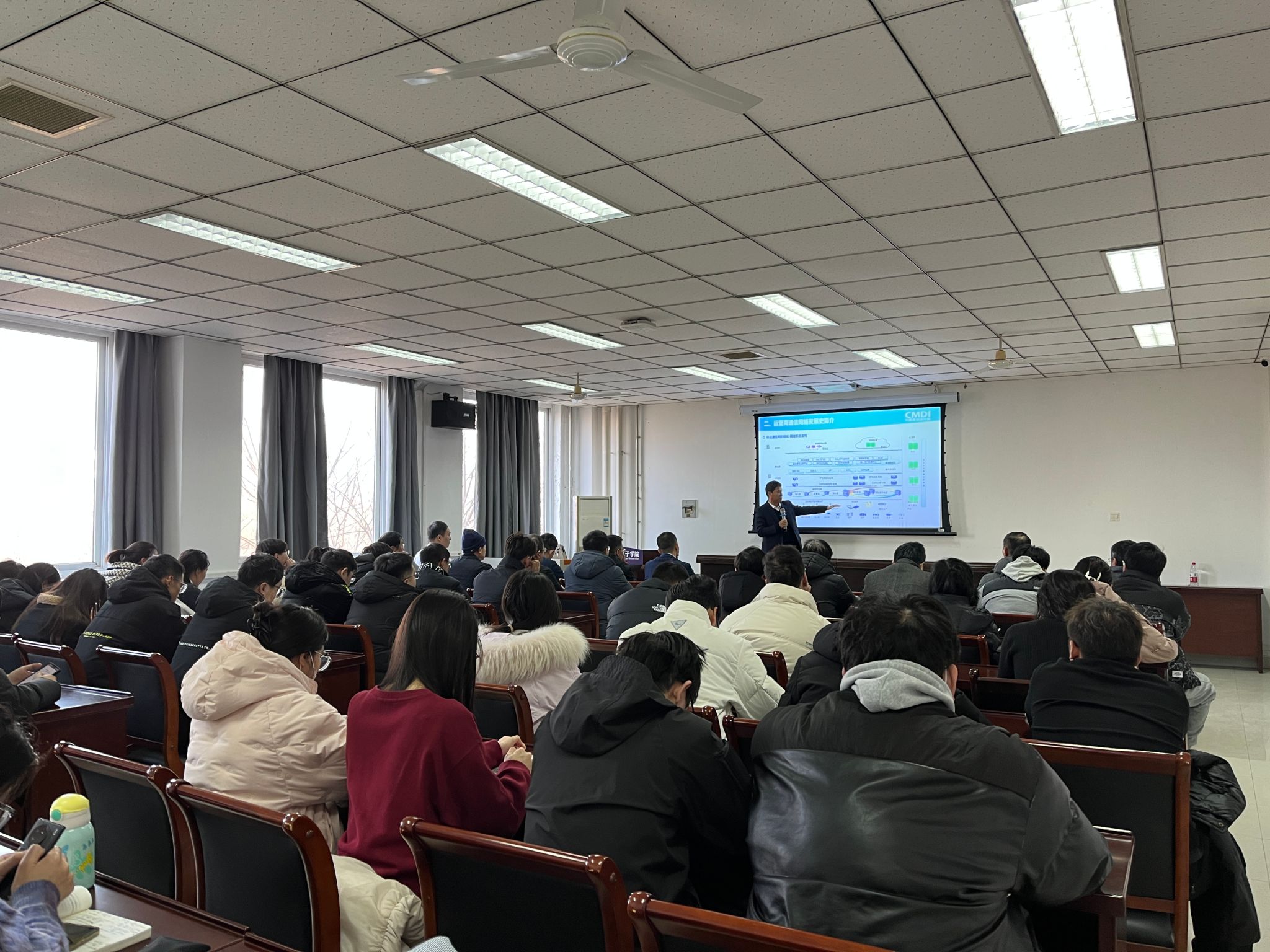 在学院A313报告厅,赵占军做《移动通信算网发展趋势》专题报告,他深入浅出地分享了移动通信网络的发展历程和未来趋势。报告内容涵盖了从2G、3G、4G到5G网络的演进历程,以及未来通信网络在算力网络、新通话、5G专网、绿色能源等领域的演进方向。现场气氛热烈,赵占军积极与师生互动,并就在场学生未来从业方向做解答建议。报告增进了学院教师和研究生对移动通信网络发展的了解。