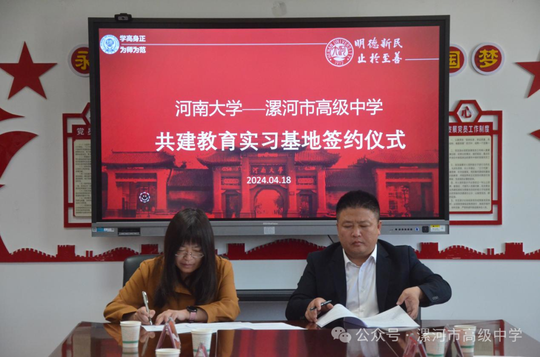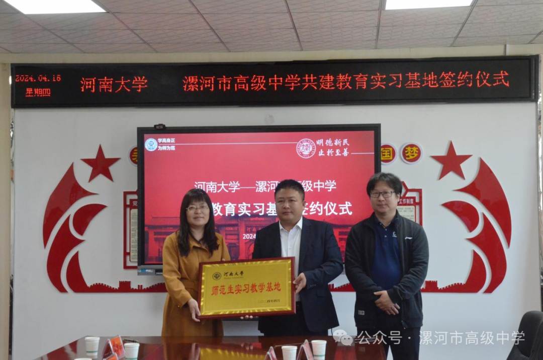 与郭爱红签署了校外实习教学基地合作协议,并向漯河高中授予了“师范生实习教学基地”的牌匾。