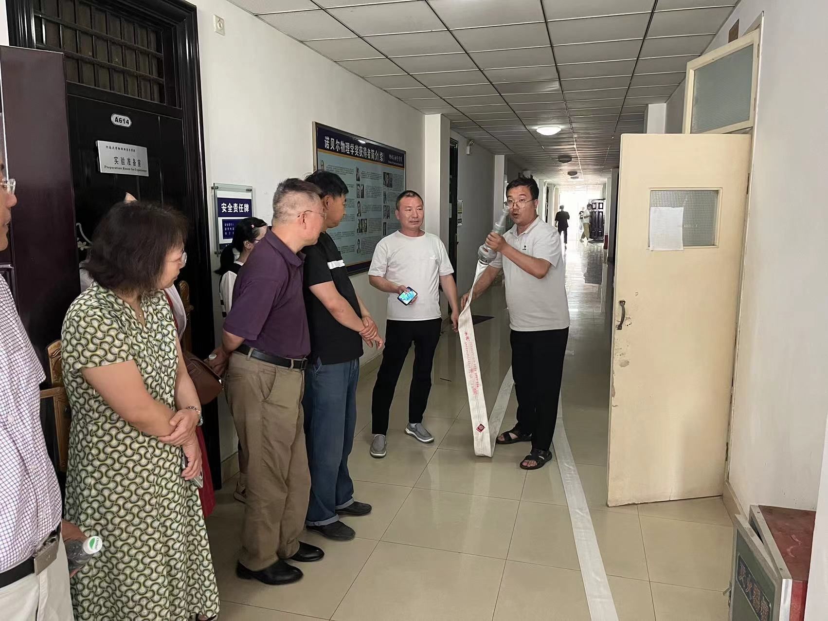随后,在物理楼 A 栋,消防科副科长刘川申带领专家亲临现场进行专业指导。师生们在专家的悉心引领下,实地演练了消火栓的连接、使用、拆卸等关键技能。大家热情高涨,积极踊跃参与,全神贯注地按照操作步骤认真练习。最终,打开消火栓成功进行了模拟灭火操作,亲身感受和体验了灭火的紧张过程。