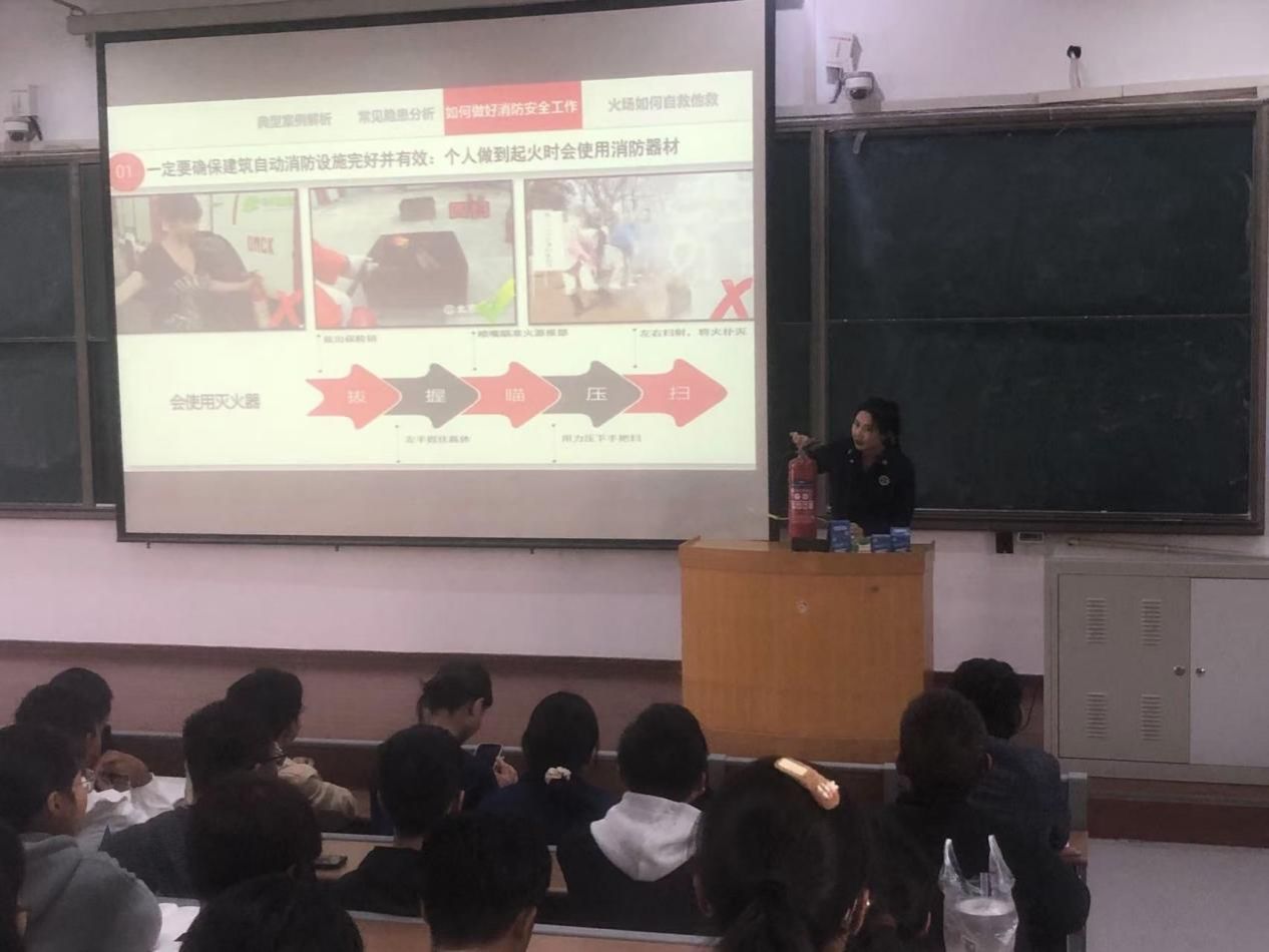 李楠在讲座中从典型校园消防案例解析、常见隐患分析、如何做好校园消防安全工作和火场如何做好自救他救等几个方面进行宣讲,并现场通过实物演示为同学们讲解了灭火器等消防器材的使用方法、注意事项。