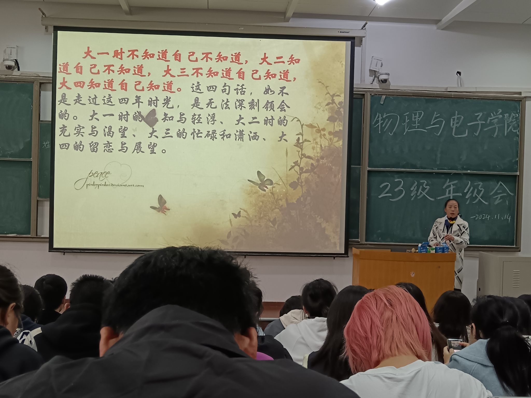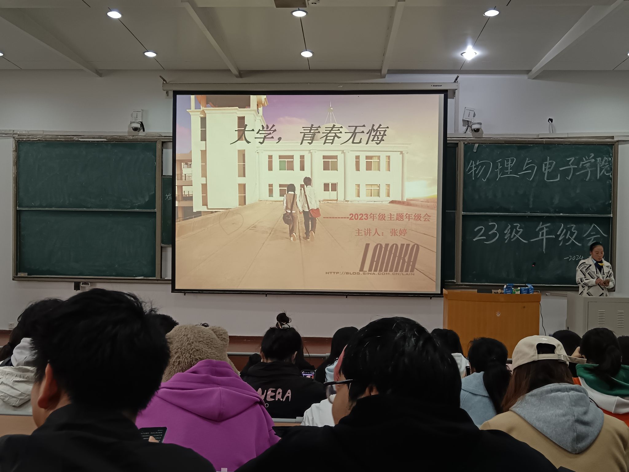 在金明校区综合楼2306教室召开2023级本科生年级会。张婷老师主持会议并围绕“大学,青春无悔!”这一主题,从班级建设、心理健康教育、人生规划以及当前目标设定等多个方面展开讲解。