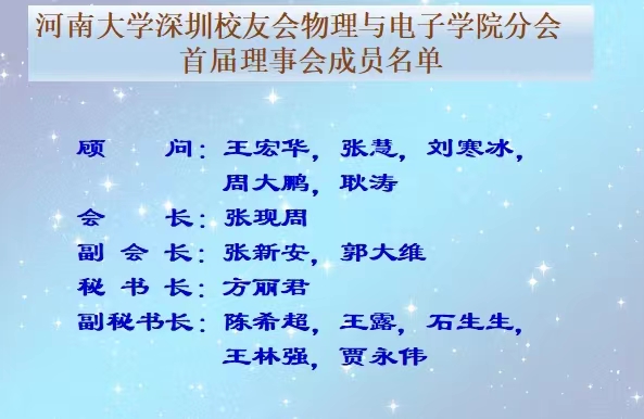 校友恪守“明德新民,止于至善”的校训和“复性正心,格物穷理”的院训,志存高远、追求卓越、努力拼搏,在深圳这个改革开放前沿的城市,充分发挥河大物理人的智慧和学识,开辟新天地,创造新价值,努力谱写人生的华彩乐章,为母校的“双一流”建设和母院高质量发展作出新的贡献。