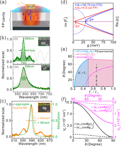 等离激元-单辐射子强耦合为室温单光子水平制备和操纵量子态提供了可能,其在室温量子信息处理领域拥有广阔的应用前景。然而,等离激元共振的巨大损耗使其与单辐射子强耦合十分低效(当前其成功率仅~1%),严重阻碍其实际应用。为突破这一瓶颈,刘仁明教授与中山大学王雪华教授团队合作,巧妙利用泄露型Fabry-Perot(F-P)光学介质微腔来设计金属等离激元谐振腔所处的电磁环境,成功将单个金属纳米颗粒等离激元共振衰减线宽压缩为原来的1/3,实现其与激子线宽的较好匹配;在降低等离激元共振损耗的同时,协同调节等离激元-单激子耦合系统量子奇异点临界耦合强度,大幅增加了耦合系统能级劈裂宽度并降低了耦合系统衰减线宽。借助光学介质微腔较低损耗电磁环境设计,在常温、常压条件下实现了等离激元-单激子强耦合作用,并将其成功率由当前的~1%大幅提高至~80%。
